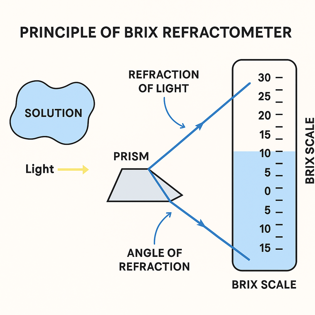 Prinsip dasar refractometer adalah pembiasan cahaya (refraction of light). Ketika cahaya melewati larutan, arah cahayanya akan dibelokkan atau dibiaskan. Semakin tinggi konsentrasi zat terlarut (misalnya gula), semakin besar sudut pembiasannya.